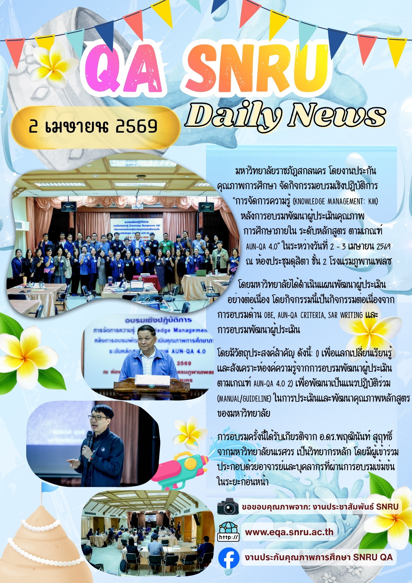 มหาวิทยาลัยราชภัฏสกลนคร โดยงานประกันคุณภาพการศึกษา จัดกิจกรรมอบรมเชิงปฏิบัติการ “การจัดการความรู้ (Knowledge management: KM) หลังการอบรมพัฒนาผู้ประเมินคุณภาพการศึกษาภายใน ระดับหลักสูตร ตามเกณฑ์ AUN-QA 4.0” ในระหว่างวันที่ 2 – 3 เมษายน 2569 ณ ห้องประชุมดุสิตา ชั้น 2 โรงแรมภูพานเพลซ
