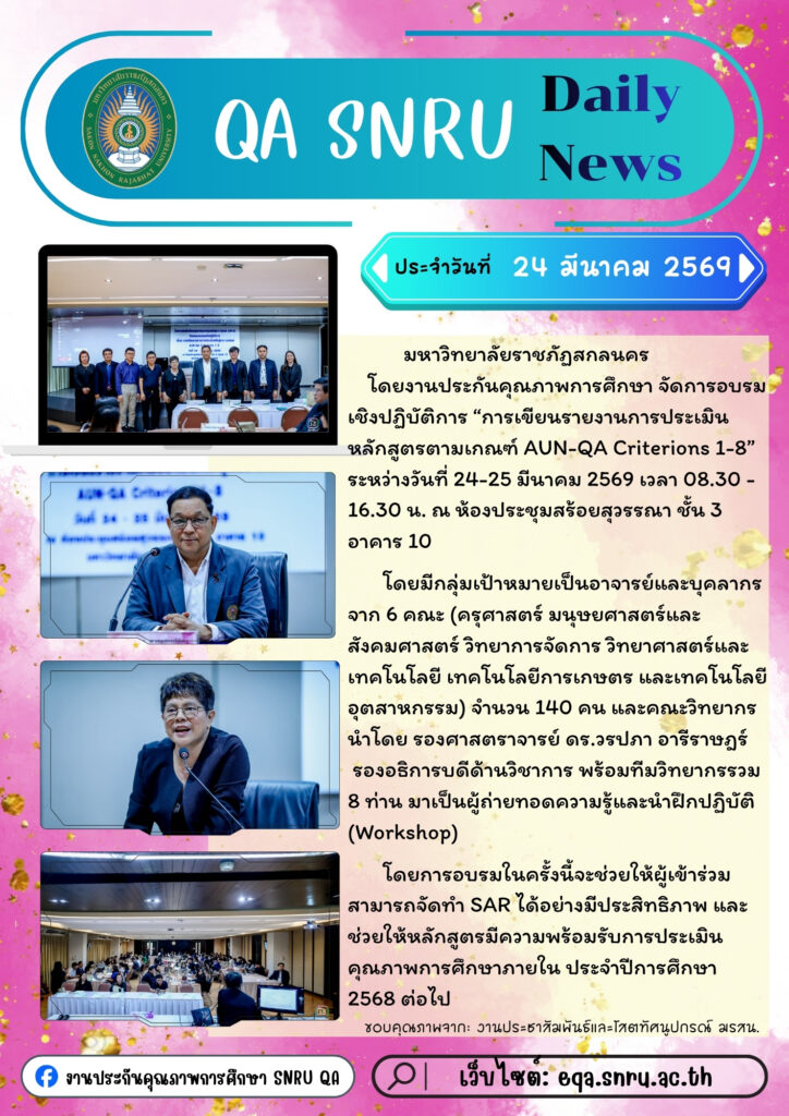 มหาวิทยาลัยราชภัฏสกลนครโดยงานประกันคุณภาพการศึกษา จัดการอบรมเชิงปฏิบัติการ “การเขียนรายงานการประเมินหลักสูตรตามเกณฑ์ AUN-QA Criterions 1-8” ระหว่างวันที่ 24-25 มีนาคม 2569 เวลา 08.30 – 16.30 น. ณ ห้องประชุมสร้อยสุวรรณา ชั้น 3 อาคาร 10
